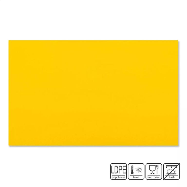 Доска разделочная 530х325х15мм, жёлтая (полиэтилен) изготовлена из высококачественного полиэтилена низкой плотности (LDPE - Low Density Polyethylene), имеет твёрдую поверхность устойчивую к повышенным температурам и истиранию, на которой не остаётся глубоких следов при резке продуктов, в которых могут оставаться частицы продуктов питания, тем самым предотвращается возможность размножения бактерий и возможно более качественно проводить санитарную обработку, при этом обеспечивается меньшая затупляемость режущей кромки ножа. Предлагаемые нами разделочные доски экологичны, не выделяют вредных веществ, гигиеничны, обладают повышенной химической стойкостью, простотой в обслуживании и не поглощают запахи.